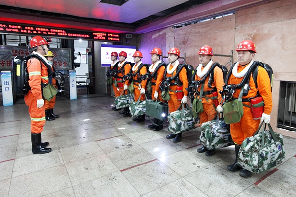 6時(shí)50分,演練以1010-1工作面第5~20架頂板淋水成線,水色混濁且含砂,有突水潰砂征兆為背景,正式開始。在接到事故報(bào)告后,現(xiàn)場(chǎng)立即啟動(dòng)《突水潰砂事故應(yīng)急預(yù)案》,成立應(yīng)急救援指揮部,緊急調(diào)度救護(hù)隊(duì)員和醫(yī)護(hù)人員出動(dòng),趕赴現(xiàn)場(chǎng)待命。