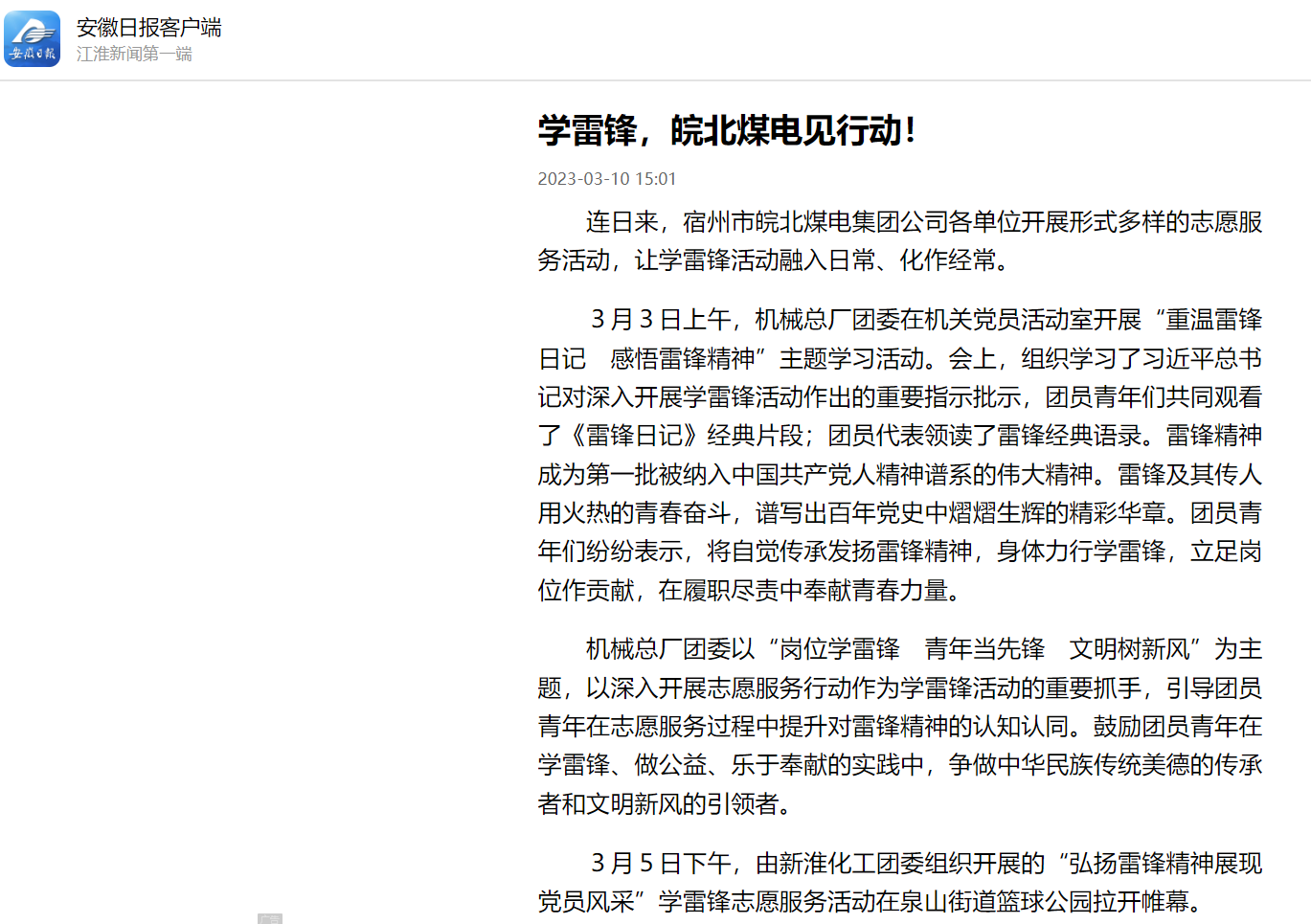 3月10日安徽日?qǐng)?bào)客戶端:學(xué)雷鋒 ,皖北煤電見(jiàn)行動(dòng)